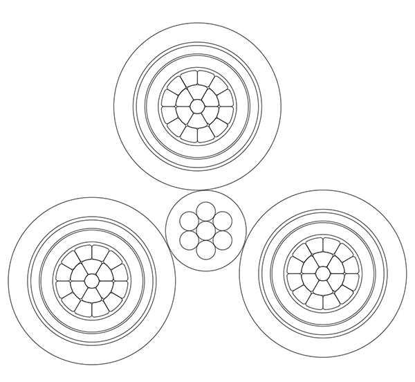 Assembly: Three XLPE insulated screened cores are bundled around the galvanized steel wires in a right hand lay.